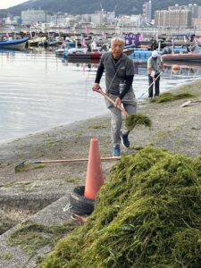 朝も早くから出廷スロープまで押し寄せてる藻を排除している。